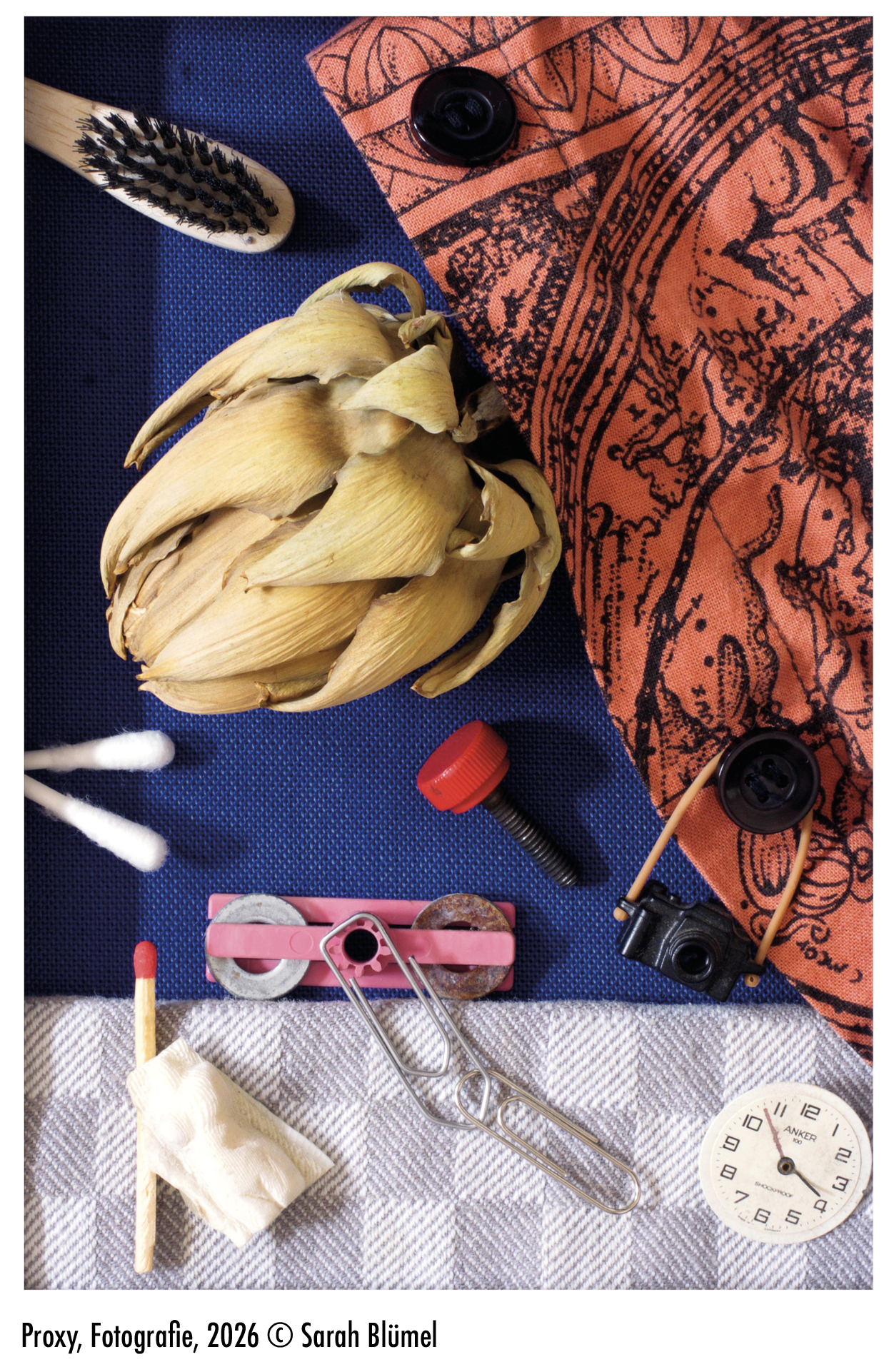 Die Serie „Proxy“ untersucht das Verhältnis von Mensch und Objekt, wobei Alltagsgegenstände als Stellvertreter fungieren und indirekte Porträts erzeugen. Vorgefunden oder inszeniert, zeigen sie Spuren menschlicher Existenz und werden zu autonomen Zeichen. Der Titel verweist auf eine verborgene Instanz, einen heimlichen Akteur, der hinter den Dingen wirkt und die Grenze zwischen Fiktion und Wirklichkeit verschiebt.